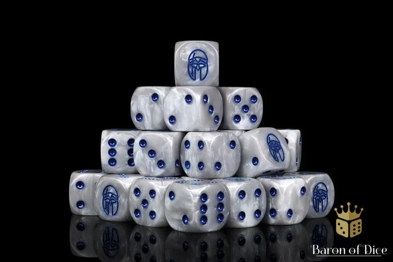 These contain a mixture of ancient marbles swirled with alabaster greys and inlaid with a loyal blue; resin 16mm dice. The symbols are on the ONE side. Yes, the ONE side.