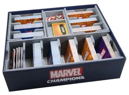 Insert compatible with Marvel Champions: The Card Game, with space for over 900 sleeved or 1,400 unsleeved cards. The design provides both efficient storage and improved game play. The rules act as a lid on top of the trays.