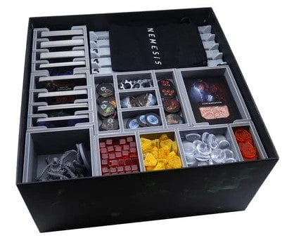 Insert compatible with Nemesis. The design provides both efficient storage and improved game play. The trays can be utilised during the game, and they greatly aid set-up and clear-away times. The rules and boards act as a lid on top of the trays.