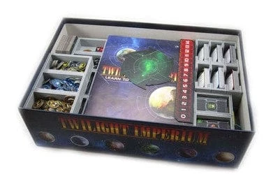 Insert compatible with Twilight Imperium 4th Edition, and has space provided for future expansions. The design provides both efficient storage and improved game play. Many of the trays can be utilised during the game, and they greatly aid set-up and clear-away times. The rules and boards act as a lid on top of the trays.