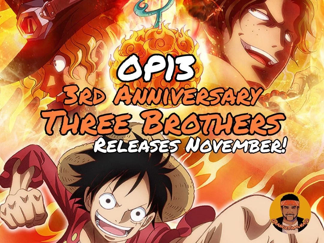 OP13 has been announced via the GAMA Expo press release. OP13 will be the game’s 3rd Anniversary Celebration Booster Pack and will revolve around The Three Brothers. Releases November 2025!