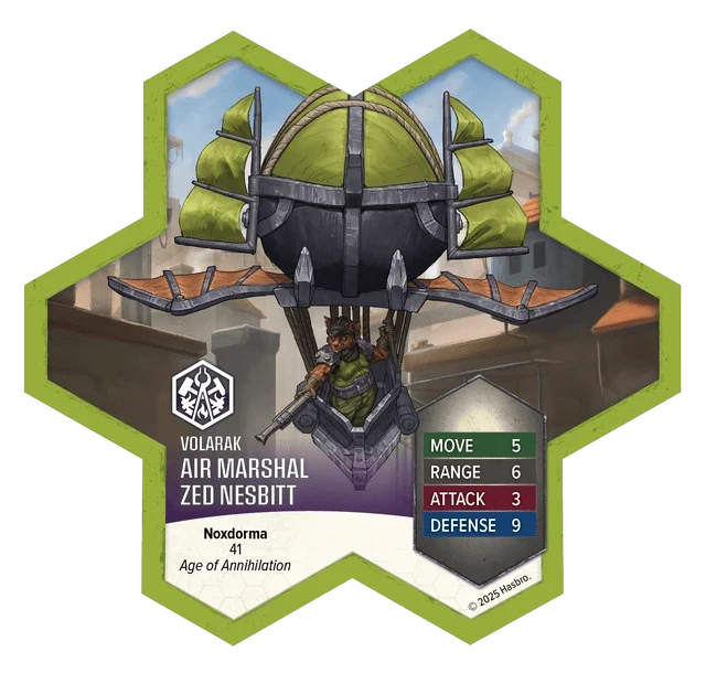 This expansion introduces Air Marshal Zed Nesbitt, a unique hero figure in the Heroscape Age of Annihilation. Nesbitt’s synergy with other Vorid figures makes him an integral part of a well-rounded army, providing both offensive power and strategic deployment options. His custom-engineered war dirigible allows him to execute daring maneuvers, making him a formidable presence on the battlefield!