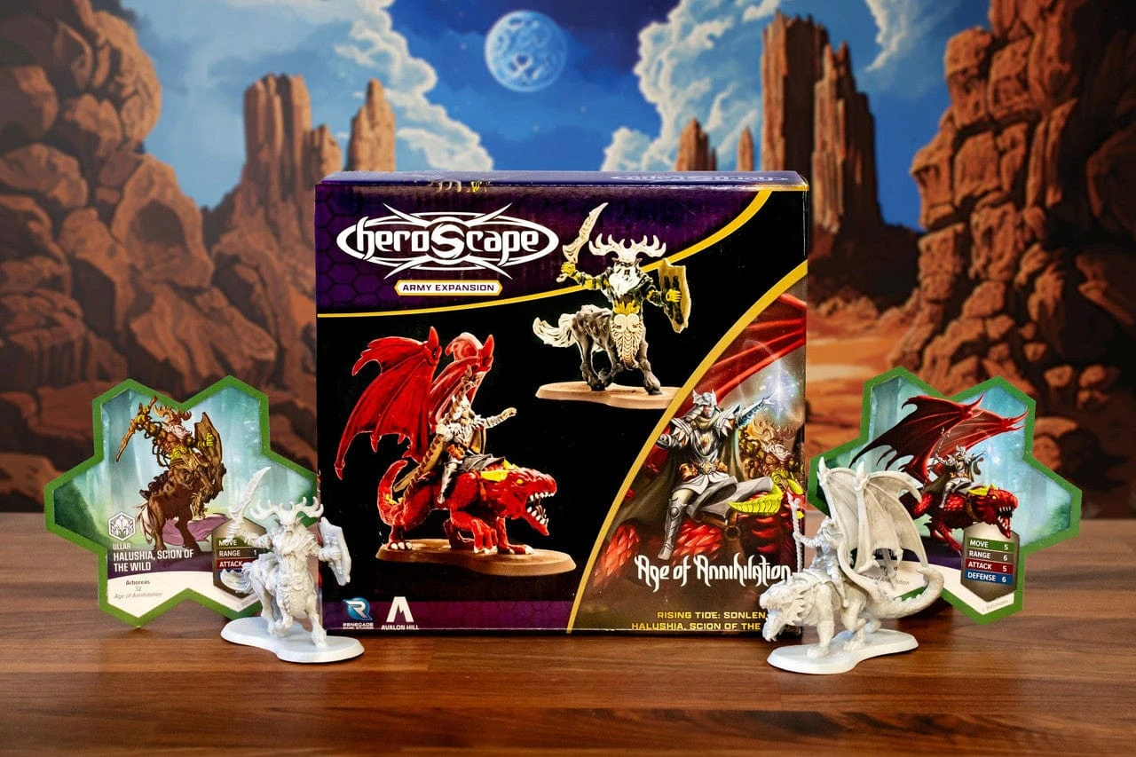 Reawaken the ancient powers of the wild with the dynamic duo of Sonlen and Halushia, Scion of the Wild. These figures bring a unique blend of mystical abilities and primal fury to your Heroscape battlefield. Together, they embody the balance between nature’s nurturing spirit and its untamed ferocity, making them powerful allies or fearsome adversaries.